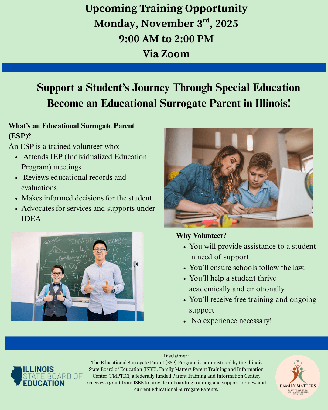 An Educational Surrogate Parent (ESP) is a trained volunteer who advocates for the educational rights of students with disabilities who do not have a parent or legal guardian available to make special education decisions. ESPs serve students in, juvenile justice facilities, residential placements, or those who are unaccompanied and need someone to ensure they receive appropriate educational services. They act in place of a parent in the special education process, attending IEP meetings, reviewing evaluations, and making informed decisions about the student’s educational needs to ensure they receive the support and services required under the Individuals with Disabilities Education Act (IDEA).