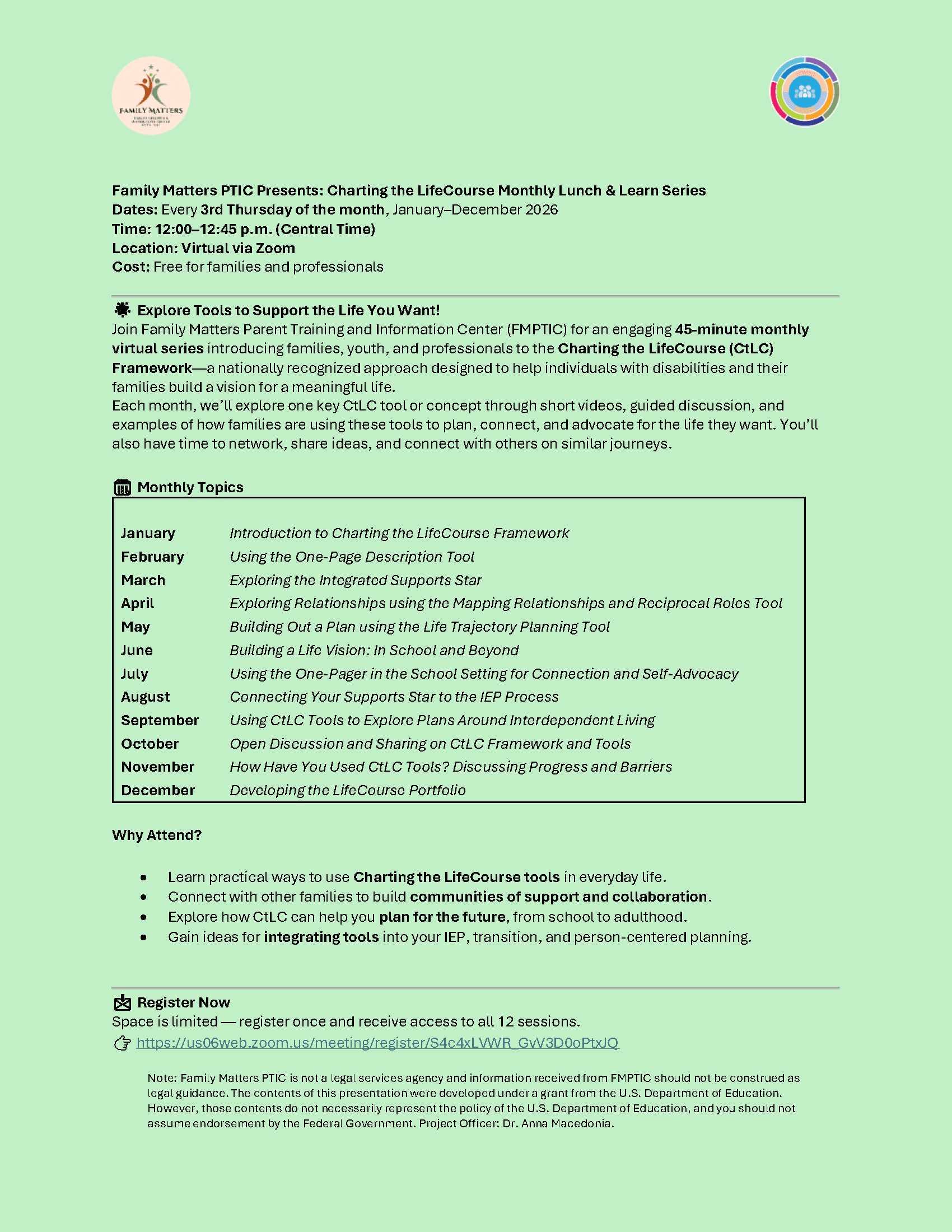 Join Family Matters Parent Training and Information Center (FMPTIC) for an engaging 45-minute monthly virtual series introducing families, youth, and professionals to the Charting the LifeCourse (CtLC) Framework—a nationally recognized approach designed to help individuals with disabilities and their families build a vision for a meaningful life.