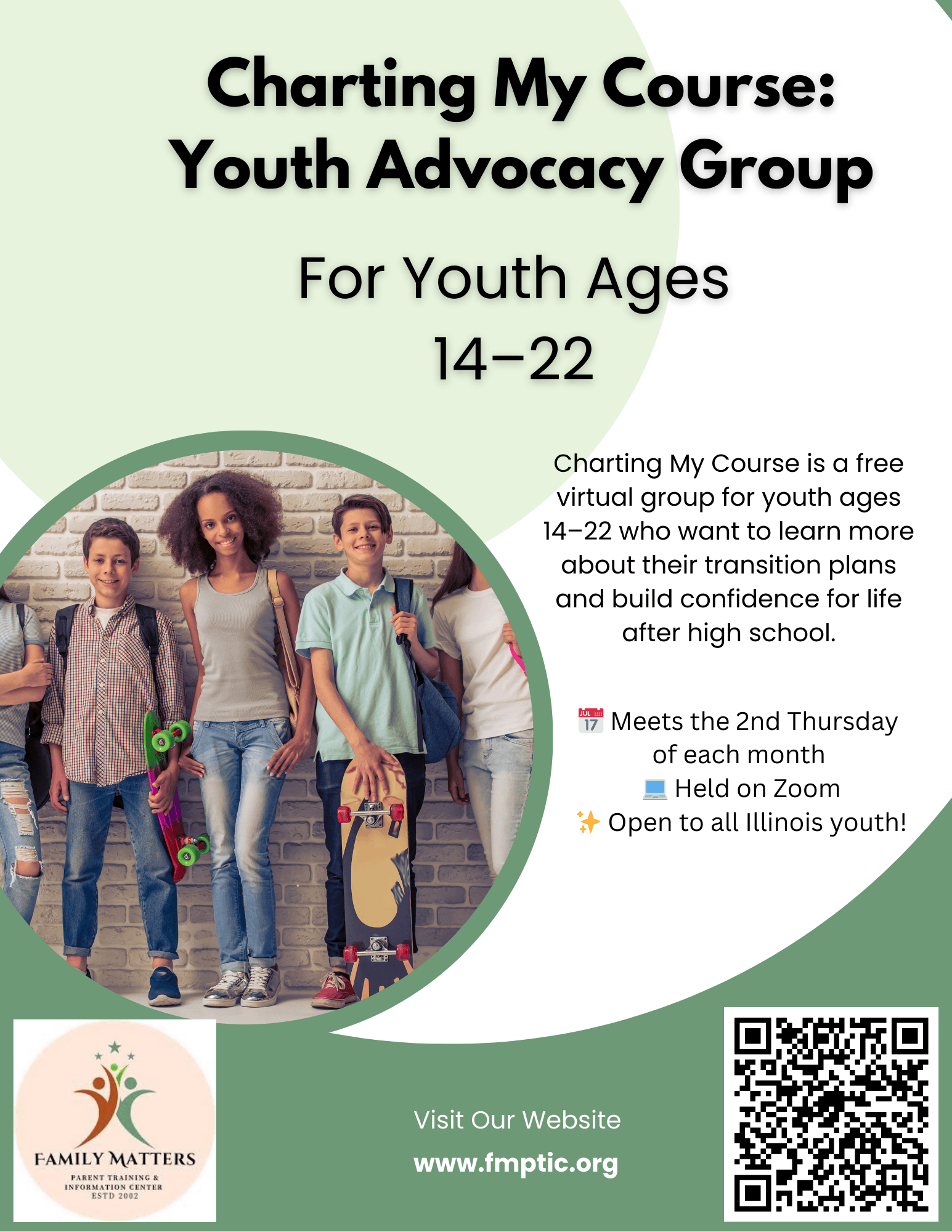 Charting My Course is a free virtual group for youth ages 14–22 who want to learn more about their transition plans and build confidence for life after high school.